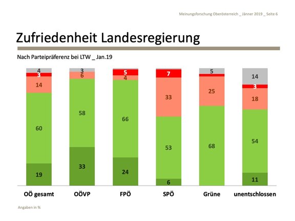 - Die Zufriedenheit mit der Landespolitik ist konstant hoch. Acht von zehn Oberösterreicher stellen der Landesregierung ein positives Zeugnis aus - und zwar quer durch alle politischen Wählerschaften. Auch die Zufriedenheit mit der Bundesregierung erreicht seit langem wieder einen positiven Saldo. Der positive Saldo der Landesregierung ist sogar drei Mal höher als jener der Bundesregierung.