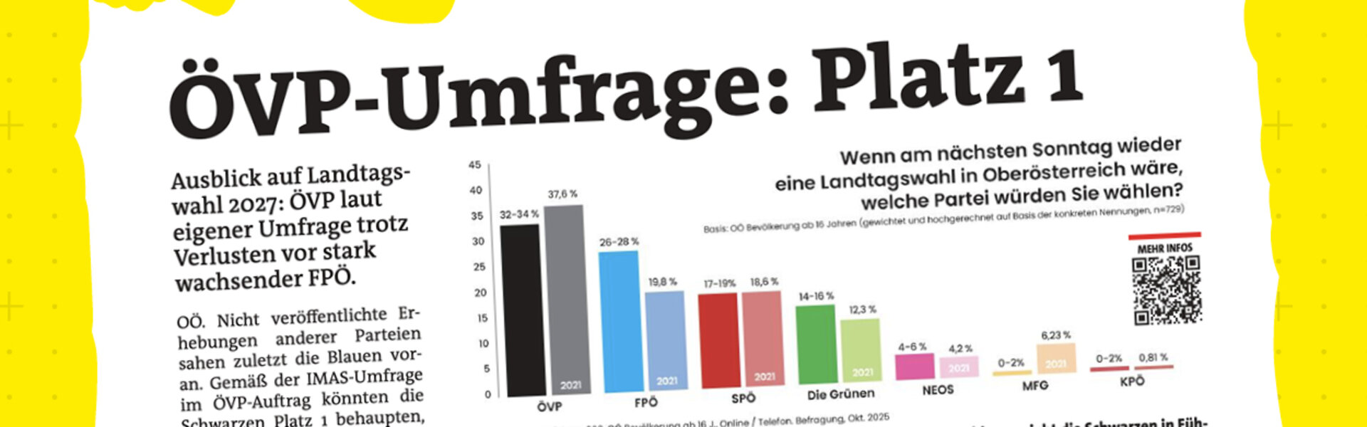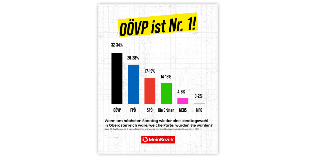 OÖVP liegt bei der Sonntagsfrage für die Oberösterreich-Wahl 2027 mit 32-34 % vor der FPÖ (26-28%). Dahinter folgt die SPÖ mit 17-19% vor Grünen mit 14-16% und den NEOS mit 4-6%.
