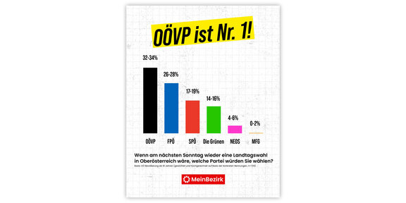 Bei der Sonntagsfrage für die Oberösterreich-Wahl liegt die OÖVP mit 32-34 % vor der FPÖ (26-28%). Dahinter folgt die SPÖ mit 17-19% vor Grünen mit 14-16% und den NEOS mit 4-6%.